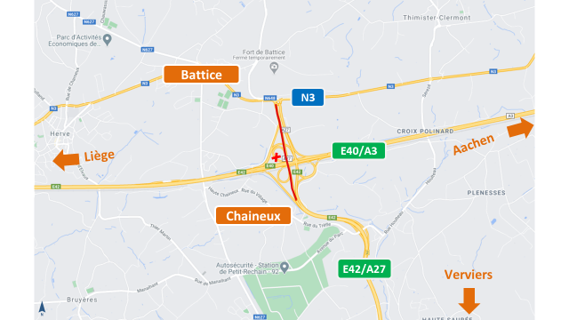 Il n’est plus possible d’accéder à l’autoroute E42/A27 à partir du « rond- point des vaches » (N3).o Une déviation est mise en place via la N3, puis l’accès Thimister de l’E40/A3 et la sortie n°36 bis « Aire de Tignée » de l’E40/A3.