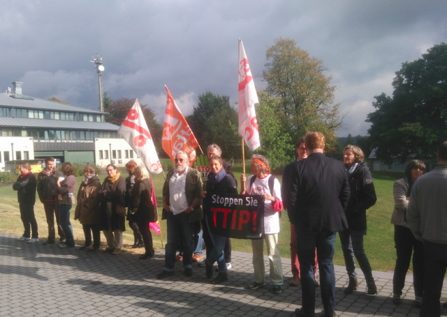 Une vingtaine de personnes ont manifesté ce lundi après-midi devant le Parlement de la Communauté germanophone à Eupen. Elles tenaient à protester contre les traités de libre-échange entre l'Union européenne et le Canada d'une part (CETA) et les Etats-Unis d'autre part (TTIP). Le sujet était il est vrai discuté en commission parlementaire. Les manifestants étaient constitués principalement de militants germanophones de l'Association pour la taxation des transactions financières et pour l'action citoyenne (ATTAC) et de représentants Ecolo. La manifestation a également été soutenue par le groupement de producteurs laitiers MIG.